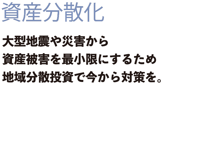 地震や噴火などの災害の被害にあう首都圏から、資産を地方や海外に分散させてオーナー様の被害を減らすご提案をいたします。